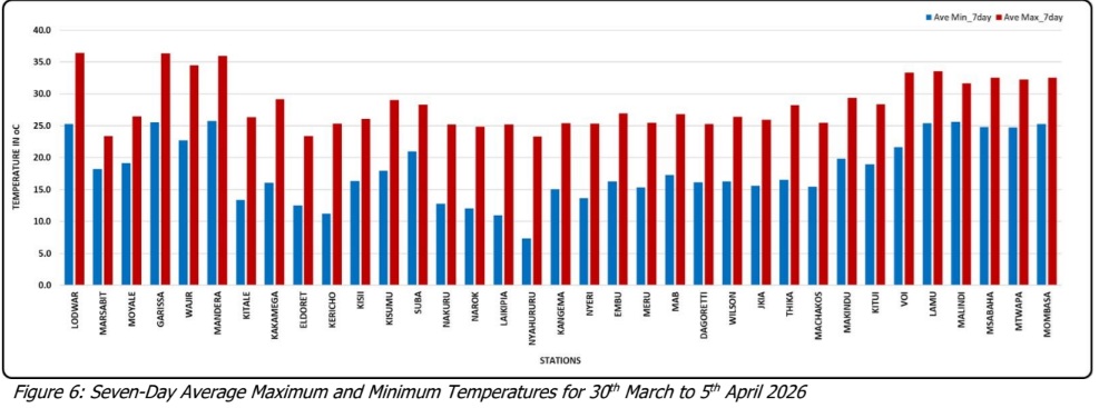 “Lodwar Meteorological Station recorded the highest seven-day average maximum temperature of 36.4°C and Nyahururu Meteorological Station recorded the lowest seven-day average minimum temperature: 7.4°C”, Met notes for the period under review.