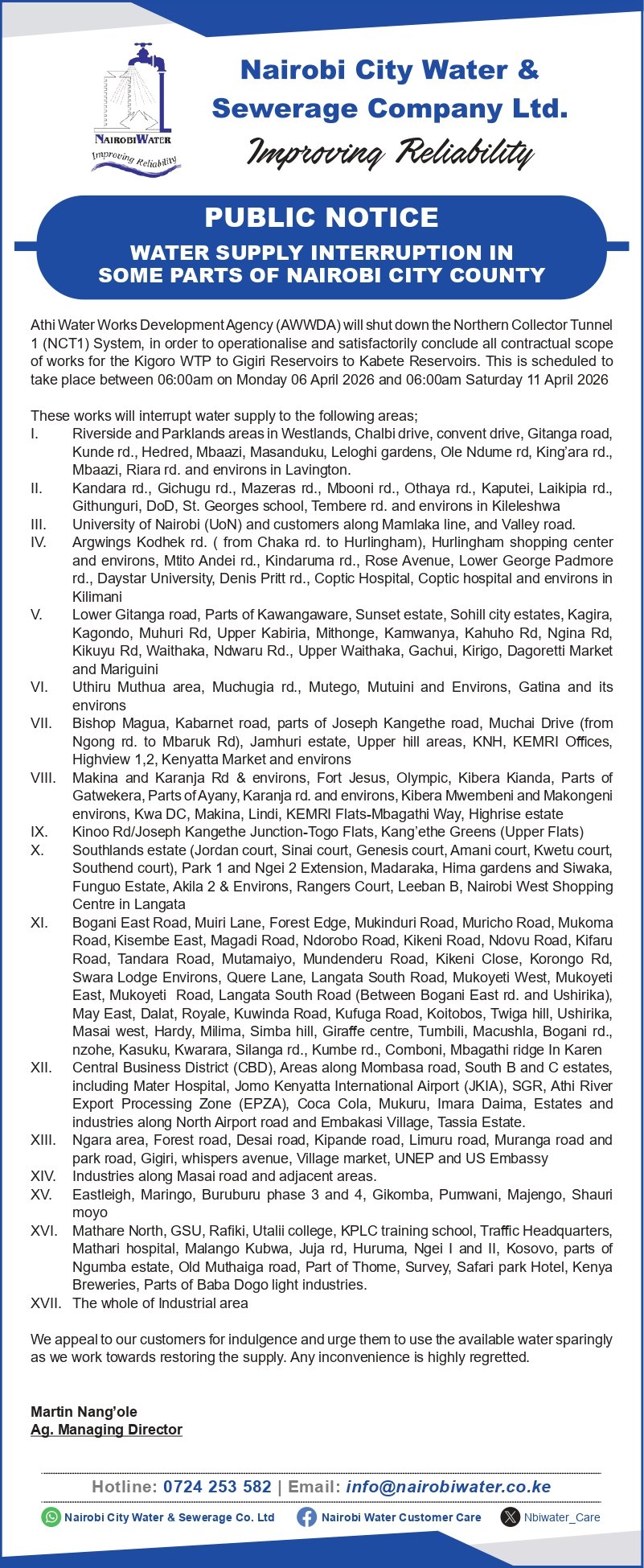 “Athi Water Works Development Agency (AWWDA) will shut down the Northern Collector Tunnel 1 (NCT1) System, in order to operationalise and satisfactorily conclude all contractual scope of works for the Kigoro WTP to Gigiri Reservoirs to Kabete Reservoirs. This is scheduled to take place between 06:00 am on Monday, 06 April 2026 and 06:00am Saturday 11 April 2026 “,  the notice reads.