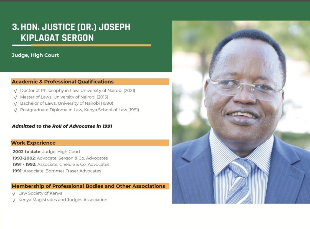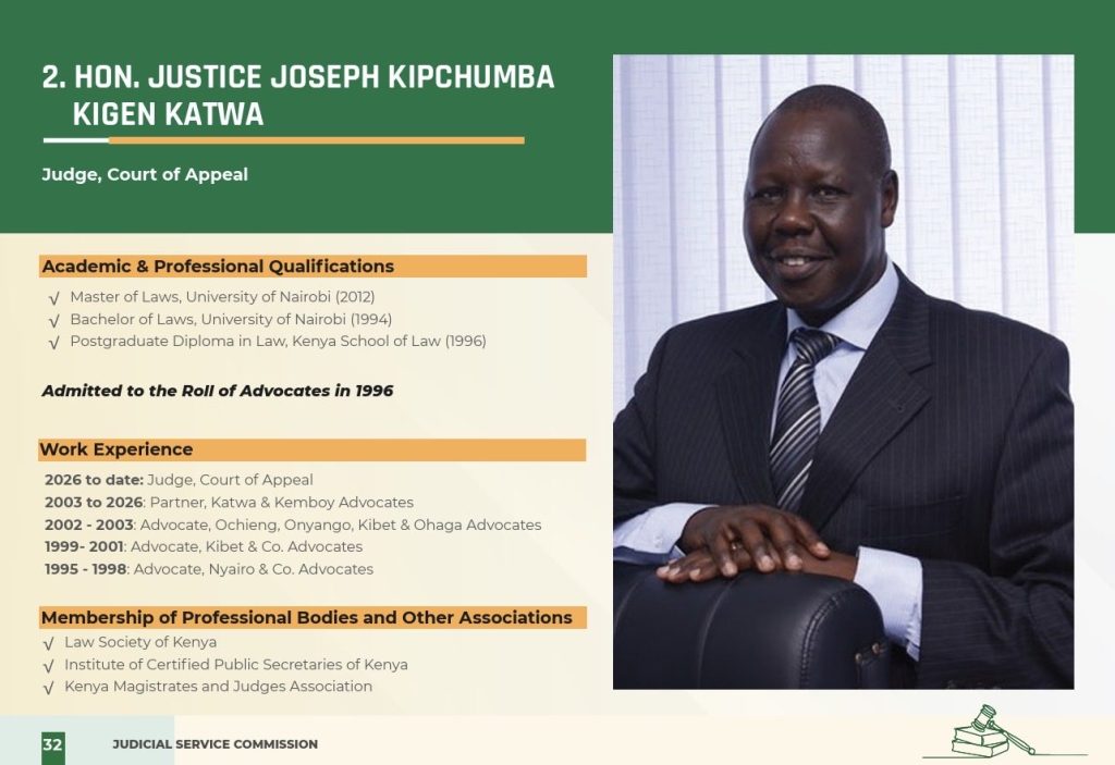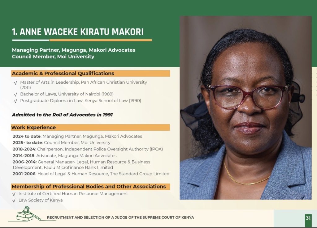 Among the candidates appearing before the panel on Tuesday are Ann Waceke Makori, alongside Justices Katwa Kigen and Joseph Sergon, who will each face questioning as part of the vetting process.