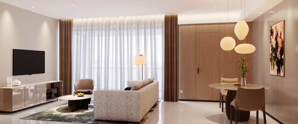 The 175 one-to-four-bedroom penthouse suites ranging from 82 sqm to 309 sqm feature a spacious dining and lounge area, a fully equipped kitchenette, a separate laundry area with washer and dryer and a private balcony that overlooks the panoramic view of the city skyline.
